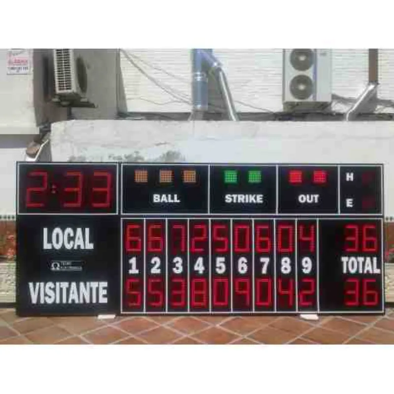 Marcador electrónico de béisbol de formato gigante, especialmente diseñado para ofrecer una legibilidad inmejorable en exteriores bajo luz solar directa. Su chasis robusto permite una instalación permanente en pared mediante tornillería y anclajes incluidos, siendo la solución definitiva para estadios de béisbol profesionales.