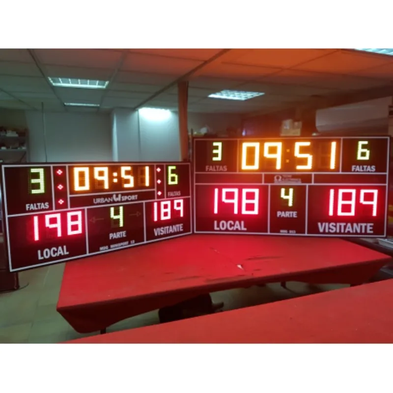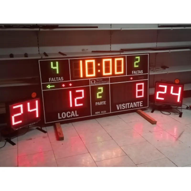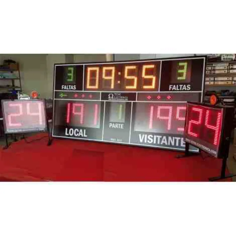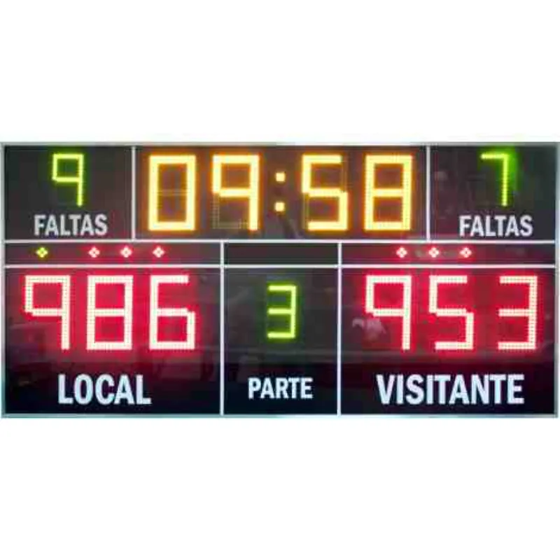 Marcador deportivo electrónico multideporte de alta visibilidad. Diseñado para instalación permanente en pared (anclajes y tornillería incluidos) o uso portátil mediante pie.
