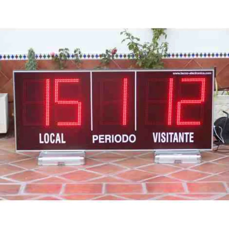 Marcador deportivo electrónico de formato gigante con cinco dígitos, diseñado para ofrecer una legibilidad inmejorable en estadios exteriores bajo luz solar directa. Es la solución definitiva para fútbol, rugby, hockey y polo en recintos de gran envergadura.