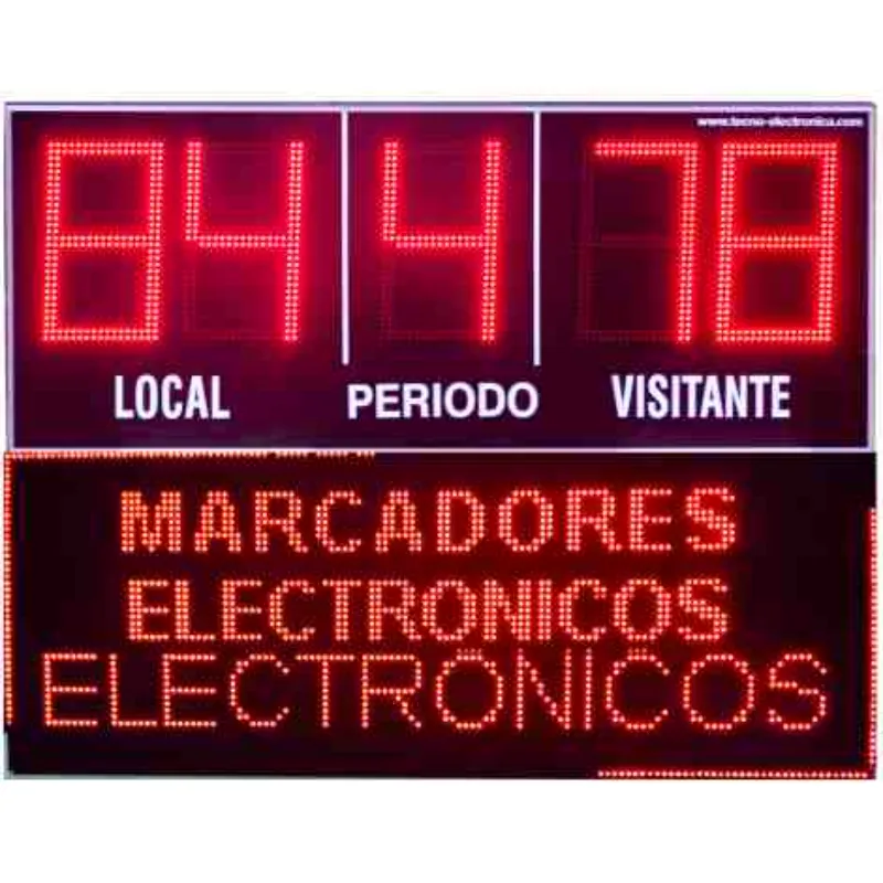 Marcador deportivo electrónico de gran formato con cinco dígitos, optimizado para su uso en exteriores bajo luz solar intensa. Por su tamaño y prestaciones, es el equipo ideal para estadios de fútbol, rugby, hockey y polo.