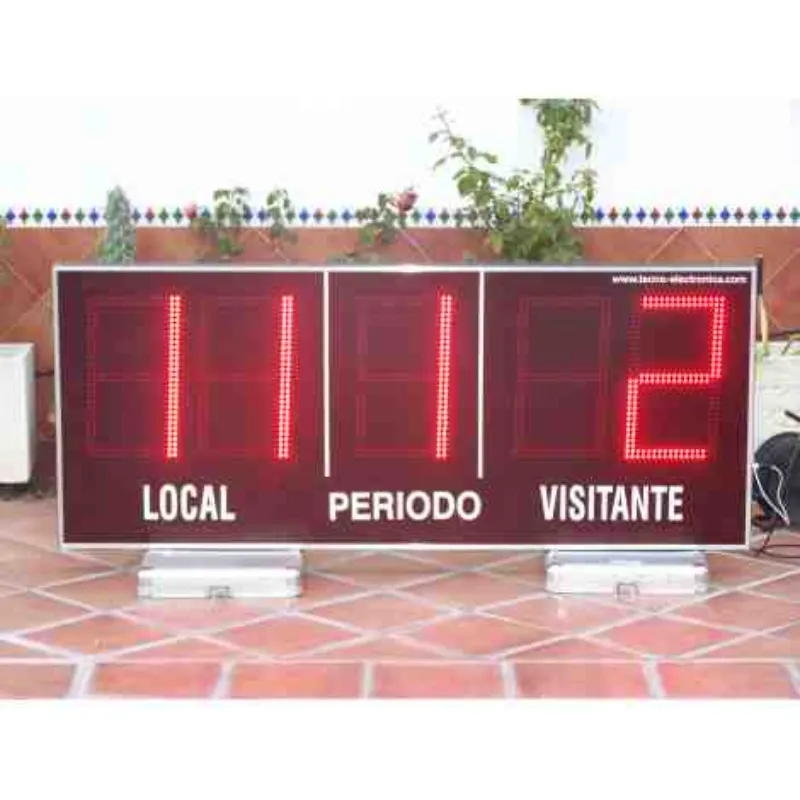 Marcador deportivo electrónico de cinco dígitos, diseñado específicamente para su uso en exteriores con luz solar. Es la solución ideal para deportes como fútbol, rugby, hockey y polo en instalaciones que requieren control de periodos.