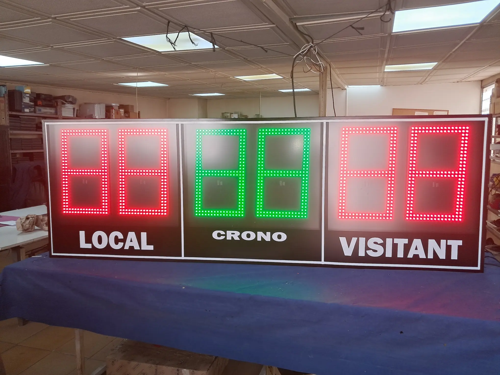 • Tanteo local / visitante (18 cm): dos dígitos LED por equipo para mostrar la puntuación de 0 a 99 goles o puntos.