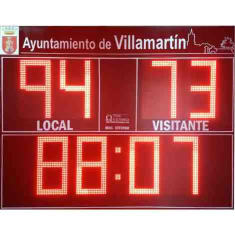 Marcador deportivo electrónico de formato gigante con ocho dígitos, diseñado para ofrecer una legibilidad inmejorable en estadios exteriores bajo luz solar directa. Su configuración completa de tiempo y puntuación lo convierte en la solución definitiva para recintos de máxima envergadura en disciplinas como fútbol, rugby, hockey y polo.
