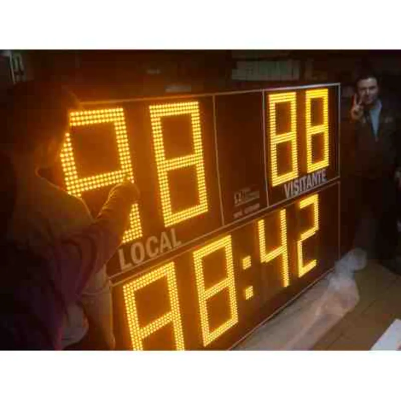 Marcador deportivo electrónico de gran formato con ocho dígitos, diseñado para ofrecer una legibilidad superior en exteriores bajo luz solar directa. Es la solución ideal para estadios de fútbol, rugby, hockey y polo que requieren un control total de tiempo y tanteo.