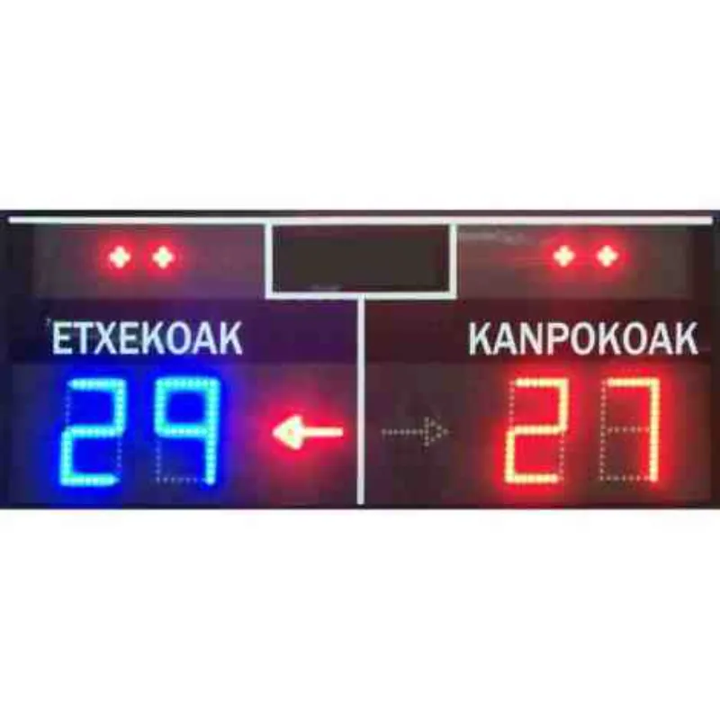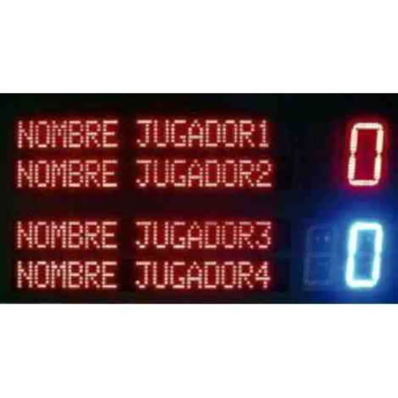 Puntuación por Equipos: Dos dígitos de 18 cm. de altura en color rojo para el Equipo A y dos dígitos de 18 cm. de altura en color azul para el Equipo B.