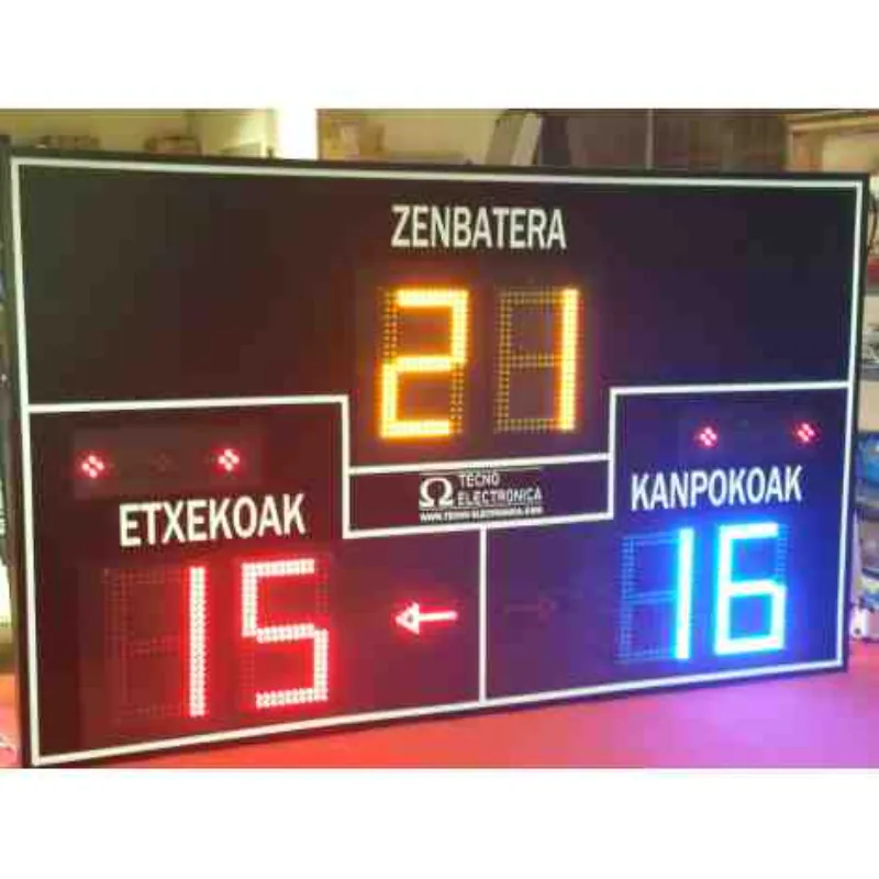 Tanteo por Equipos: Dos dígitos de 27 cm. en color rojo para el Equipo A y dos dígitos de 27 cm. en color azul para el Equipo B.