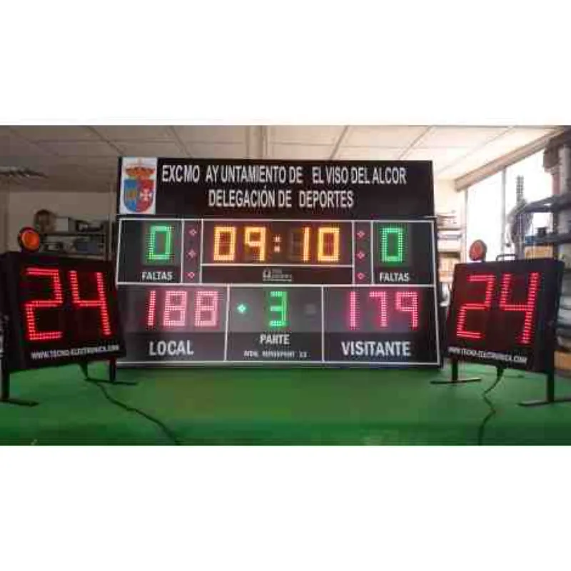 - Seis (6) dígitos de 18 cm. de altura para puntuación (0 a 199 puntos) para equipo local y visitante.