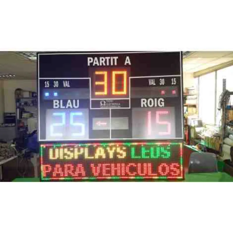Puntuación y Configuración: Dos dígitos rojos de 27 cm para el equipo A, dos azules de 27 cm para el equipo B y dos amarillos de 27 cm para indicar los puntos totales del partido.